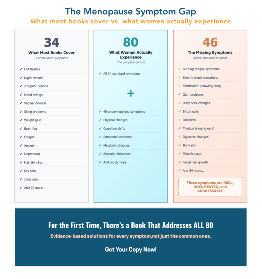 You're not imagining it. Burning tongue, electric shock sensation, frozen shoulder, these are real menopause symptoms. But most books never mention them. This book decodes all 80 symptoms so you can finally connect the dots, stop second-guessing yourself, and make informed decisions about your health.